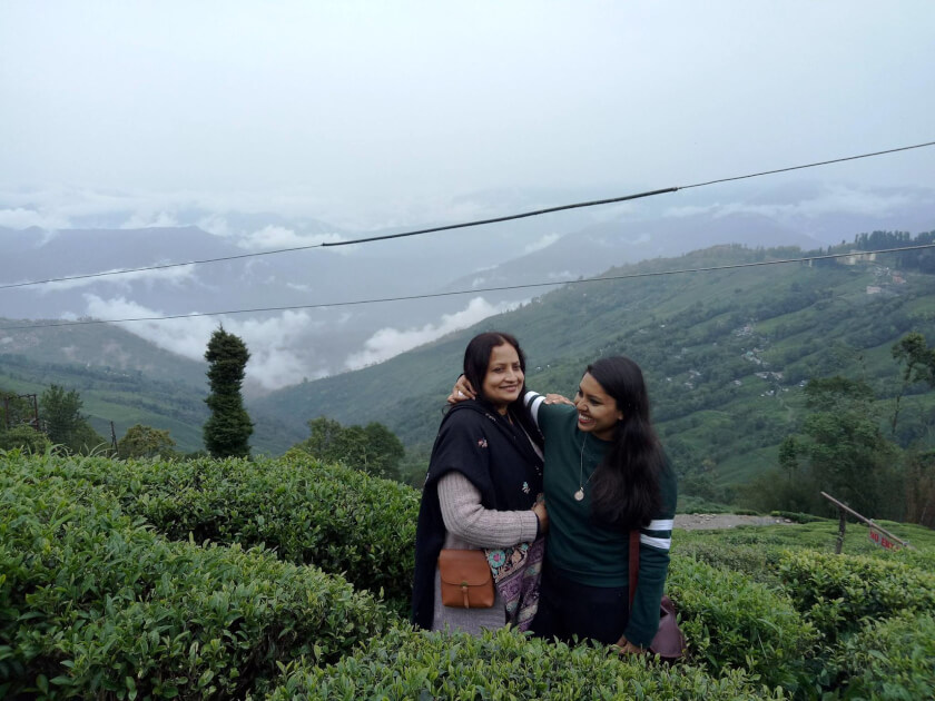 The author and her mother are in a beautiful Darjeeling tea estate.