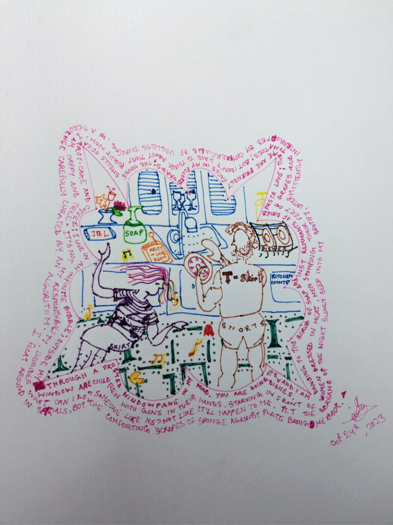 Yet the screams of the night slowly seep into my Spotify, Intermittently interrupted by commercials of useless things, In a sequence carefully curated by an algorithm. I float around in spirals, But the comforting scrapes of sponge against plate Bring me back.